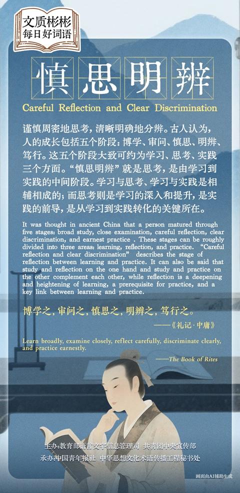 It was thought in ancient China that a person matured through five stages: broad study, close examination, careful reflection, clear discrimination, and earnest practice . These stages can be roughly divided into three areas: learning, reflection, and practice. "Careful reflection and clear discrimination" describes the stage of reflection between learning and practice. It can also be said that study and reflection on the one hand and study and practice on the other complement each other, while reflection is a deepening and heightening of learning, a prerequisite for practice, and a key link between learning and practice.