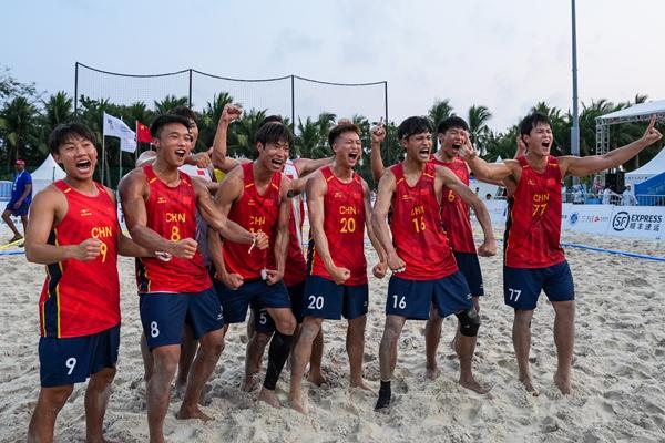 4月21日,中国队球员在赛后庆祝胜利。当日,在海南三亚举行的第六届亚洲沙滩运动会沙滩手球男子小组赛中,中国队2比0战胜斯里兰卡队。新华社记者 李博/摄
